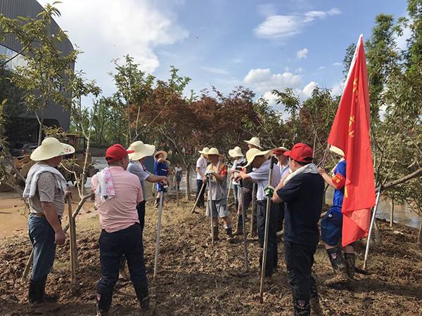 相比于前两日清洗街道路面,抗洪救灾突击队今日面临的任务更加艰巨,用锄头清理园区树木周围淤积的泥巴,让树木能够尽量存活。今日长沙艳阳高照,芭溪洲地面气温达40度左右,湿热异常,加上洪水刚退,洲上泥泞不堪,行动极其不便。虽然条件艰苦,但大家干劲十足,从下午2点一直干到下午5点,所有突击队员上衣都湿透了,身上、脸上都沾满了泥土,手上都磨起多个血泡。突击队员们挥汗如雨后,看着负责清理的树林重新焕发出生机与绿意,才露出了笑容。