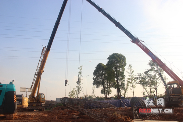 7月16日,湘府路(河西段)快速化改造工程NE18-1号桩基顺利完成混凝土水下灌筑。图为吊车进行钢筋笼吊装作业。