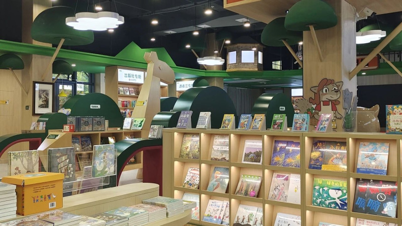 店内铺设的绿色草坪打造出“森林仙踪”场景,林木森剧场如同森林里的独栋小屋,成为孩子们举办绘本剧表演、手工课的专属天地。原木书架与绿树造型支柱营造出温润氛围,这里既是汇聚全球优质童书的阅读乐园,也是成人暂避喧嚣的心灵驿站,实现了童话与现实的温柔联结。